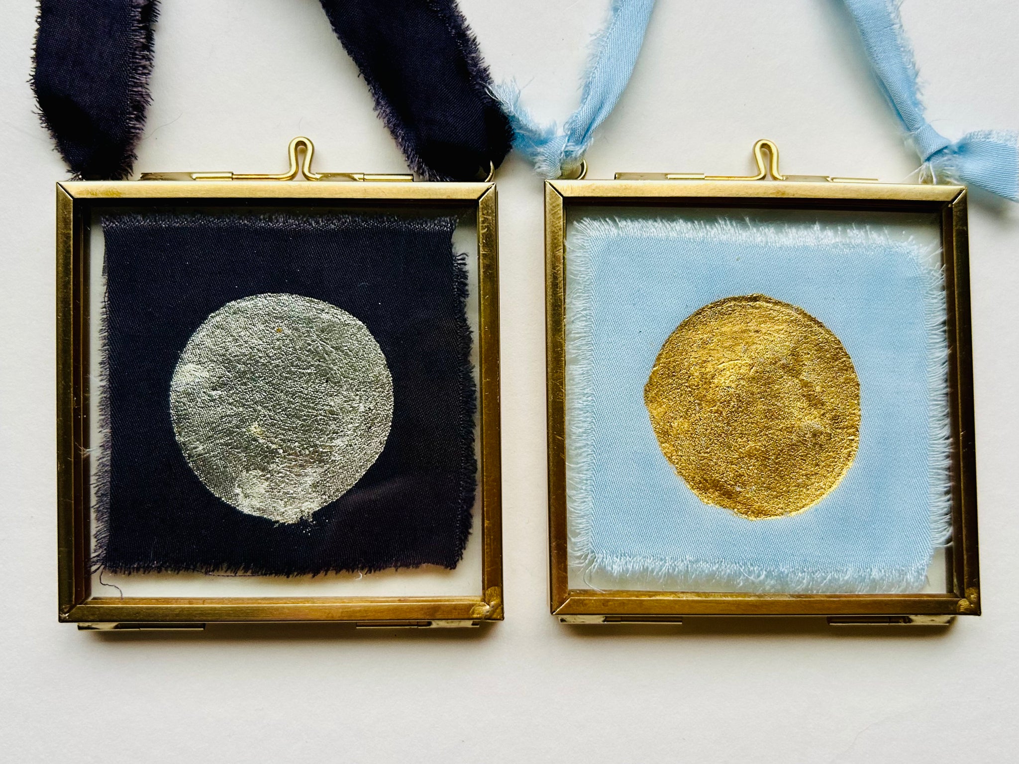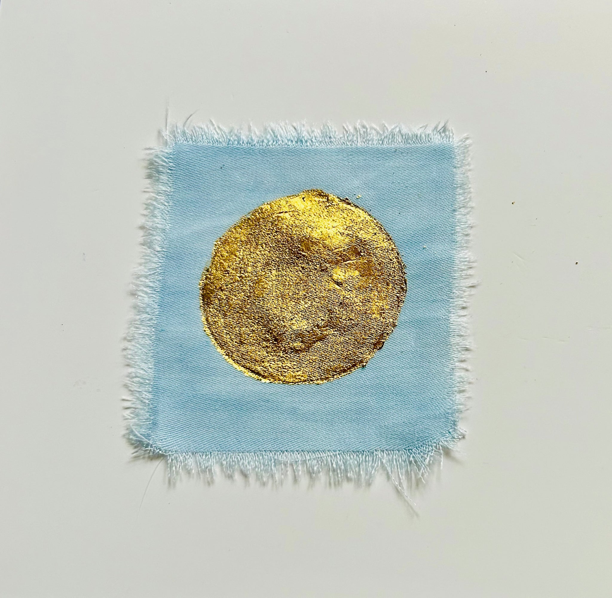 A radiant miniature sun created on bamboo silk dyed with traditional woad, an ancient European dye plant. The hand-drawn sun embellishment is in 24 carat gold lead.